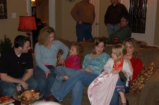 Woohoo! Now that we're engaged Jarrod made it to the family picture at Nanny's, he's moving on up! Can you see how long Jarrod's hair is? That's the longest it's been since then, too. And by the way I am not wearing the same sweater I did last year, it's a NEW black turtleneck, I love them I buy a new one every year.