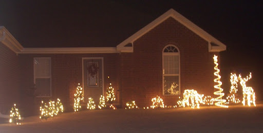 Jarrod decided that he didn't want to mess with putting lights on the house this year, and since I wasn't going to help him, I couldn't argue. It ended up looking very nice indeed! We were the only ones in our cul-de-sac with lights. You can't see as well as I'd hoped, but our "Outdoor Display" included . . . . 12 mini trees along the sidewalk, two larger trees by the door, lights throughout the shrubbery, two deer and a spiral tree.