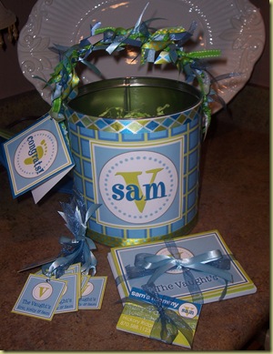 I created this cute bucket for a friend's baby shower this weekend. I designed it to match the baby's room. I also created coordinating note cards, gift tags, address labels and mommy cards. I think it turned out super cute & the mommy-to-be loved it, so that's all that really matters!