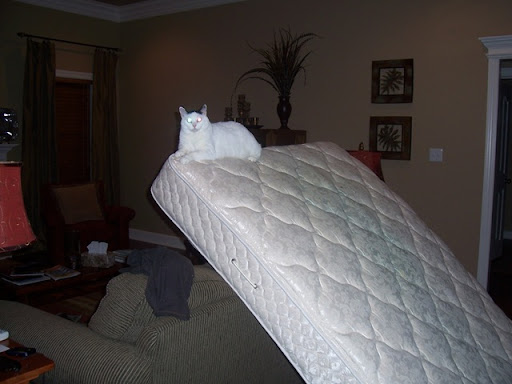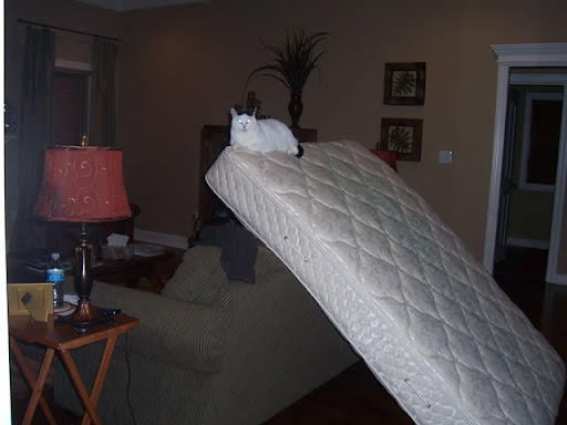 It was quite a night for us! Our first big storm in our house in Jonesboro. After hearing sirens and news that there was rotation in a storm headed for Valley View, we barricaded ourselves in a hallway with a mattress and couch cushions. Luckily we received no damage. It was scary for me, since I am terrified of tornadoes! Jarrod was as cool as a cucumber throughout the whole thing.After the storms were all over Taki perched herself on the mattress we had been using earlier in the hallway.